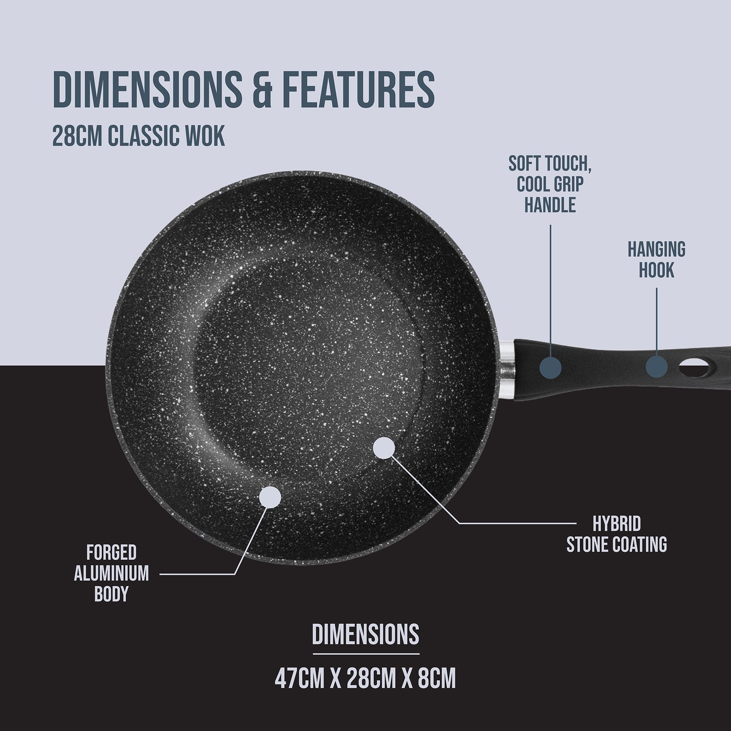 The wok allows you to cook healthy, nutritious stir-fry’s, rice dishes & paella’s, with little to no oil, thanks to the non-stick properties. The kitchen wok has a forged aluminium base, and also features a hybrid stone coating, that allows the heat to conduct faster and retain the heat throughout the cooking process.