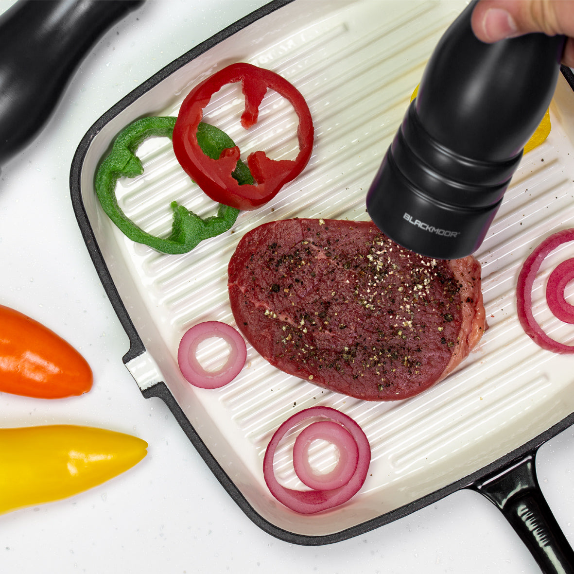 The salt and pepper mills feature an adjustable grind coarseness functionality that will let you switch between grinding up fine particles, or larger, coarser particles, all depending on the taste and texture you desire. To switch between the two coarseness settings, simply remove the top nut off the mills, and then turn the nut clockwise for a fine grind, or anti-clockwise for a courser grind.