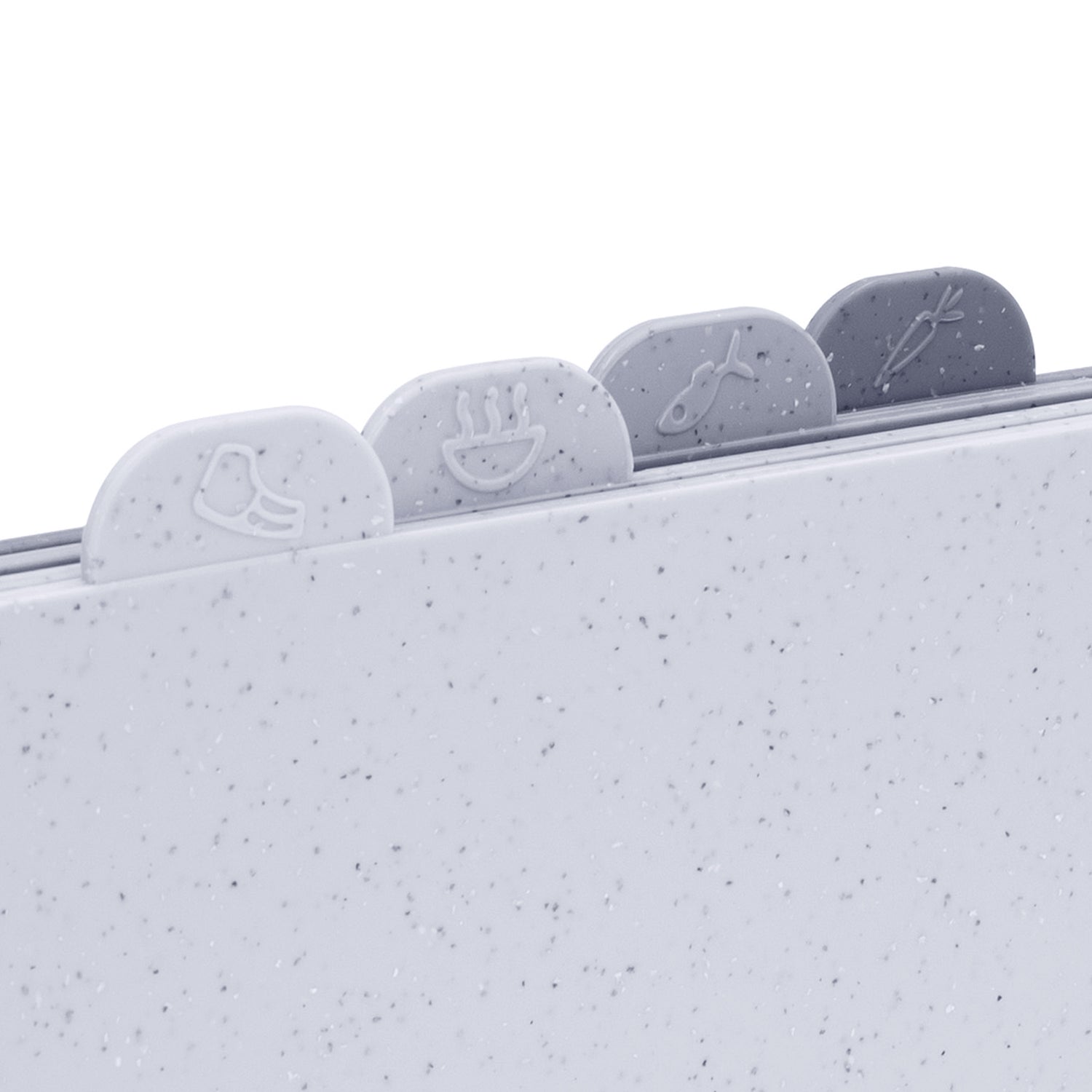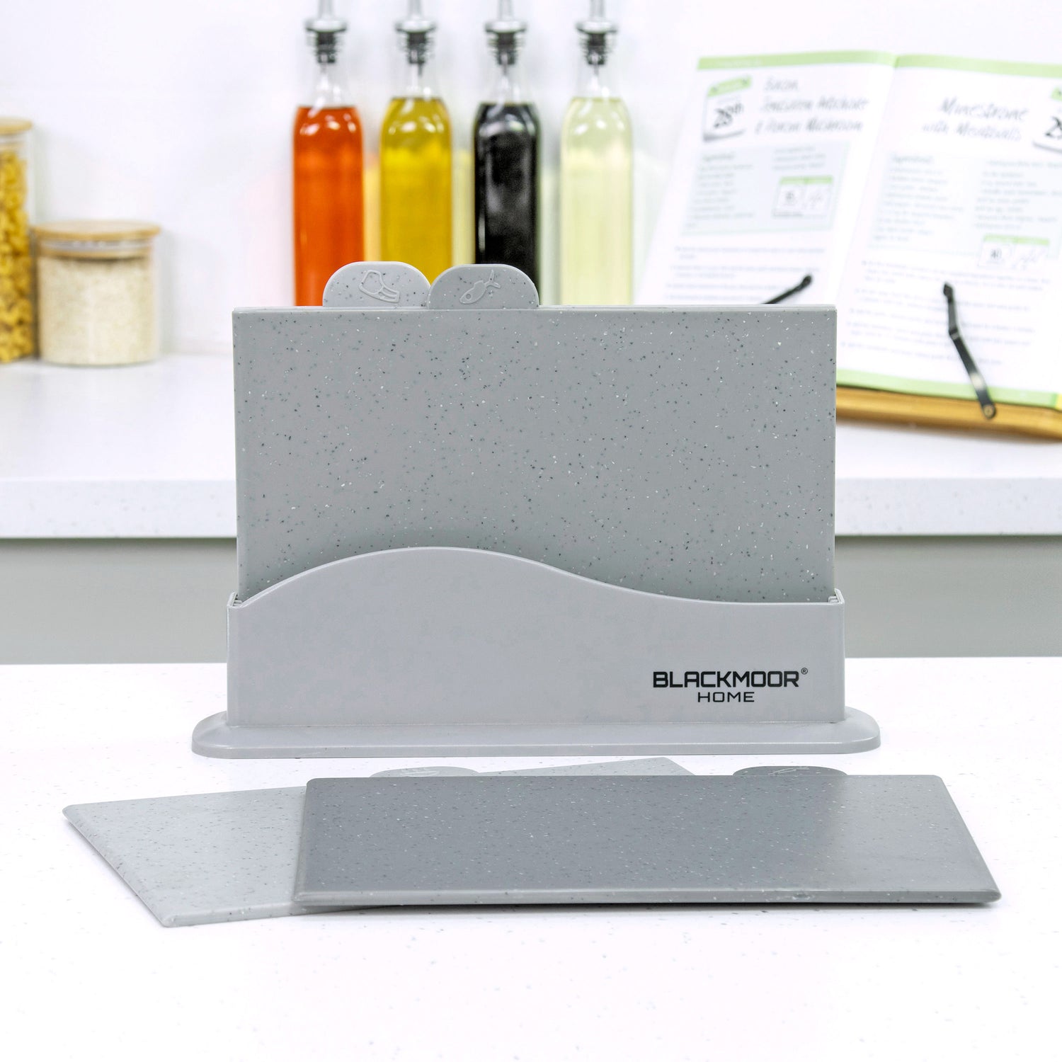 This set of 4 chopping boards is a kitchen essential that provides you with four individual surfaces for preparing meats, fish, vegetables and pre-cooked foods, alongside the ability to store them all in one place for optimised organisation.